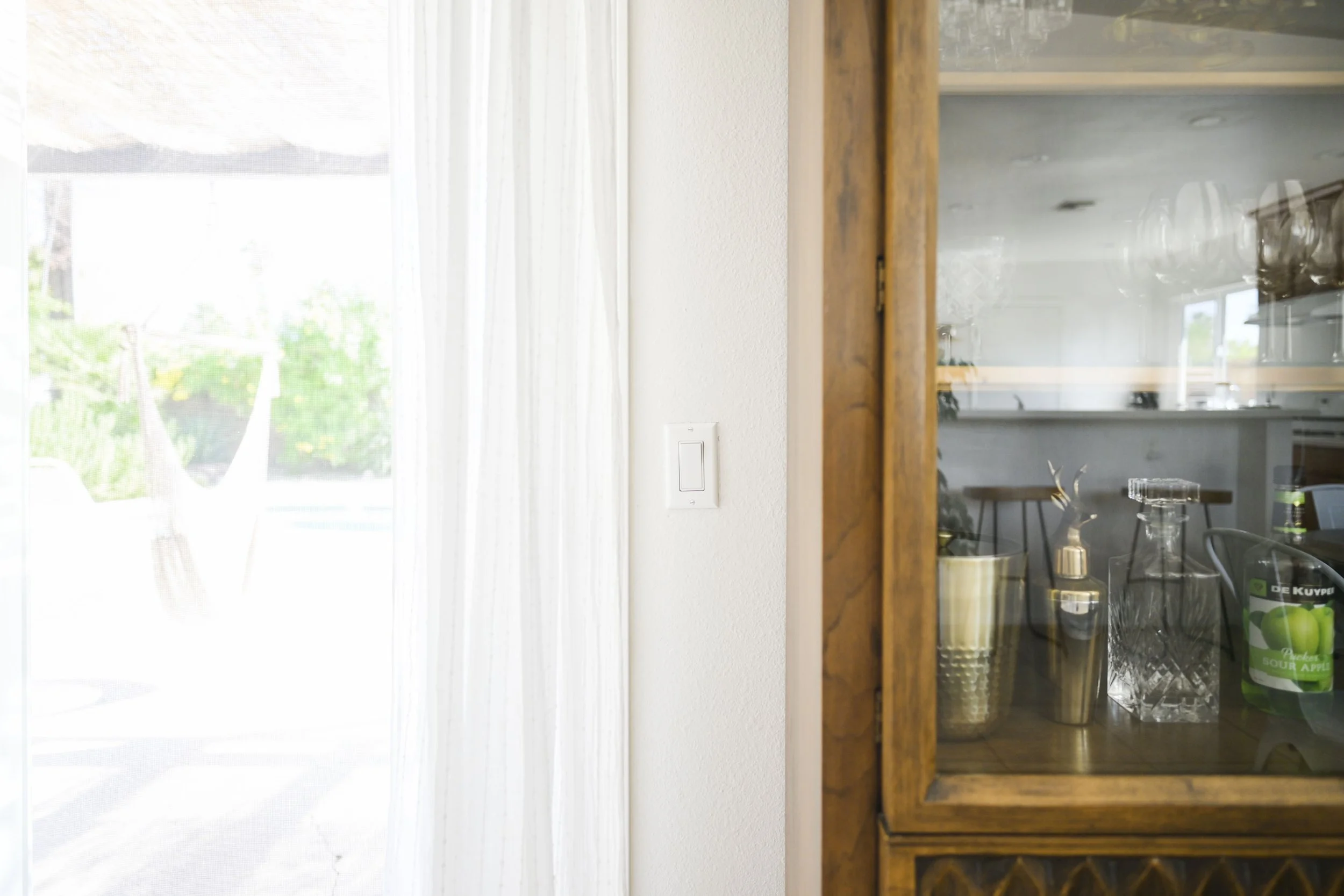 The light switch for both the patio and string light is connected into 1 switch to the right of the sliding door (and left of the hutch).