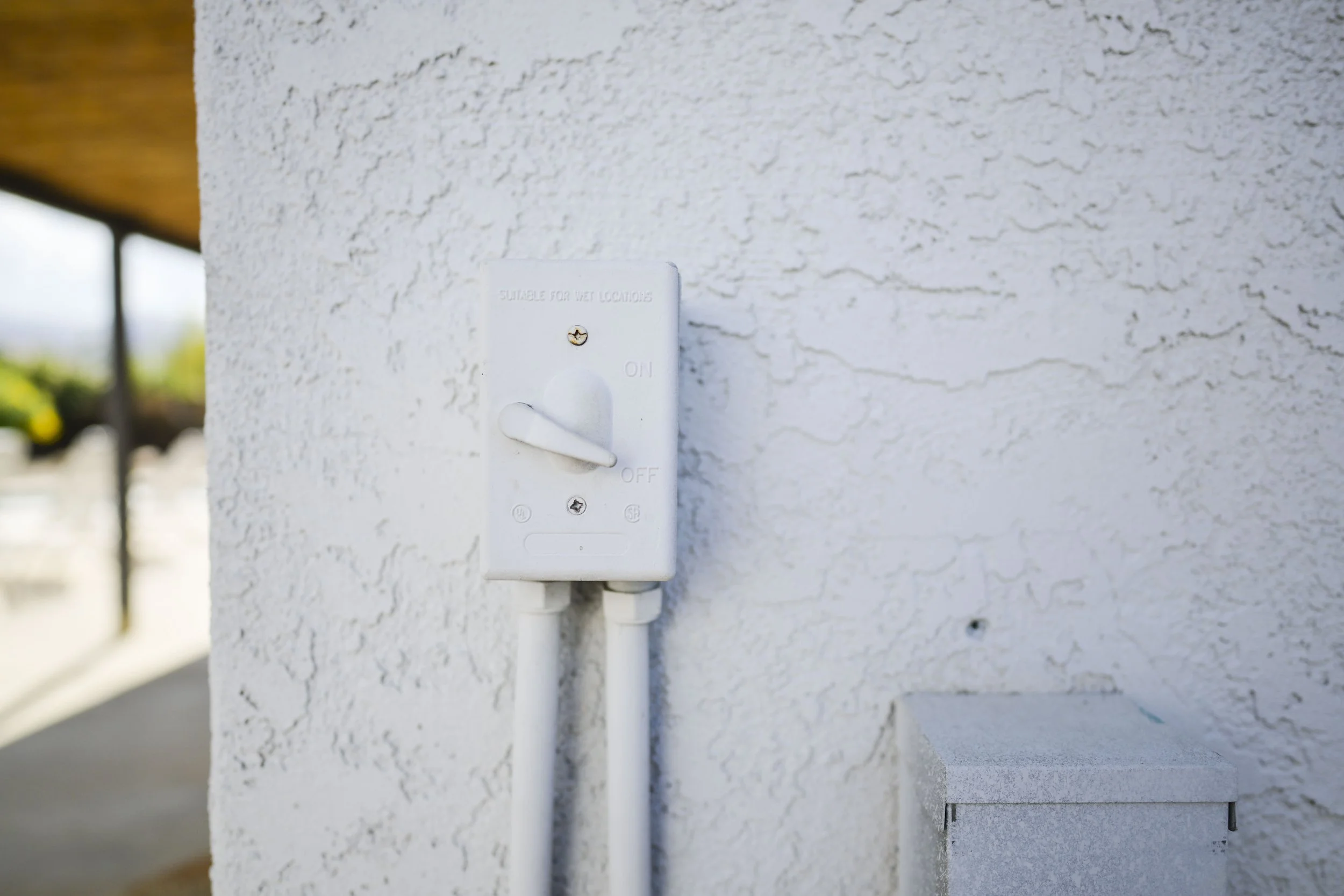 The pool light sits on the wall by the pool equipment.