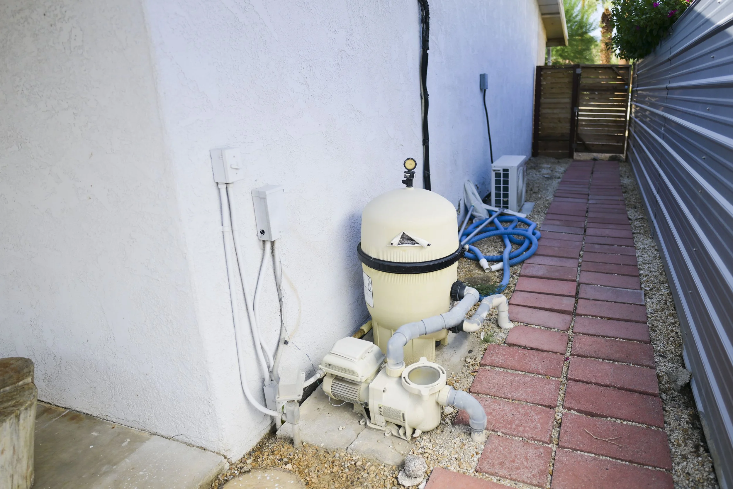 The pool equipment is located on the side of the house by the corrugated fencing.