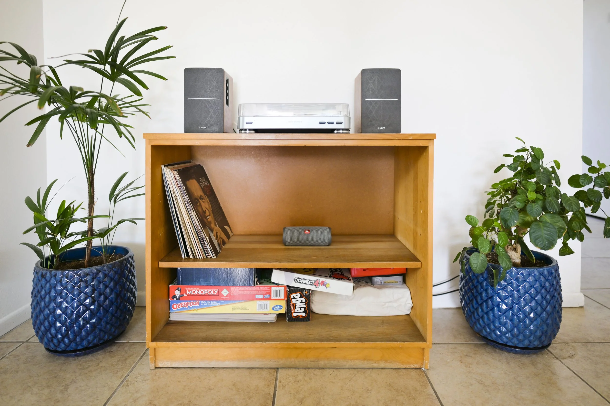 The Nest Thermostat is located just below the wall shelving above the record player and games.